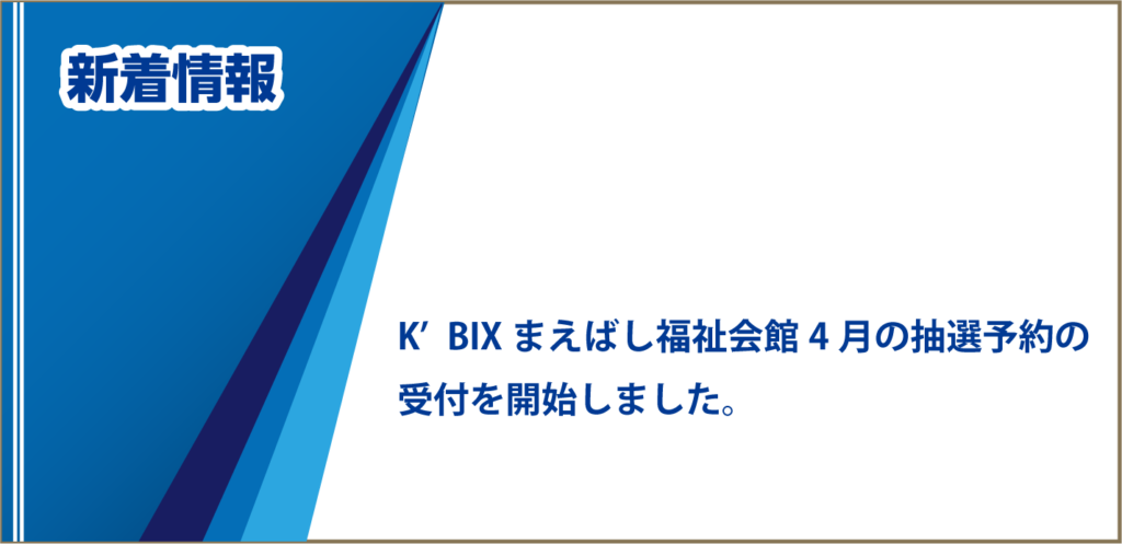 K’BIXまえばし福祉会館4月の抽選予約の受付を開始しました。