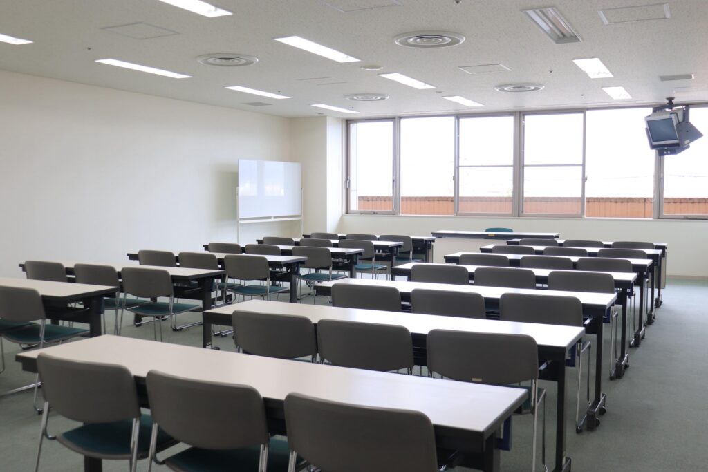 机、椅子、ホワイトボード、モニターテレビ(ビデオ付)、